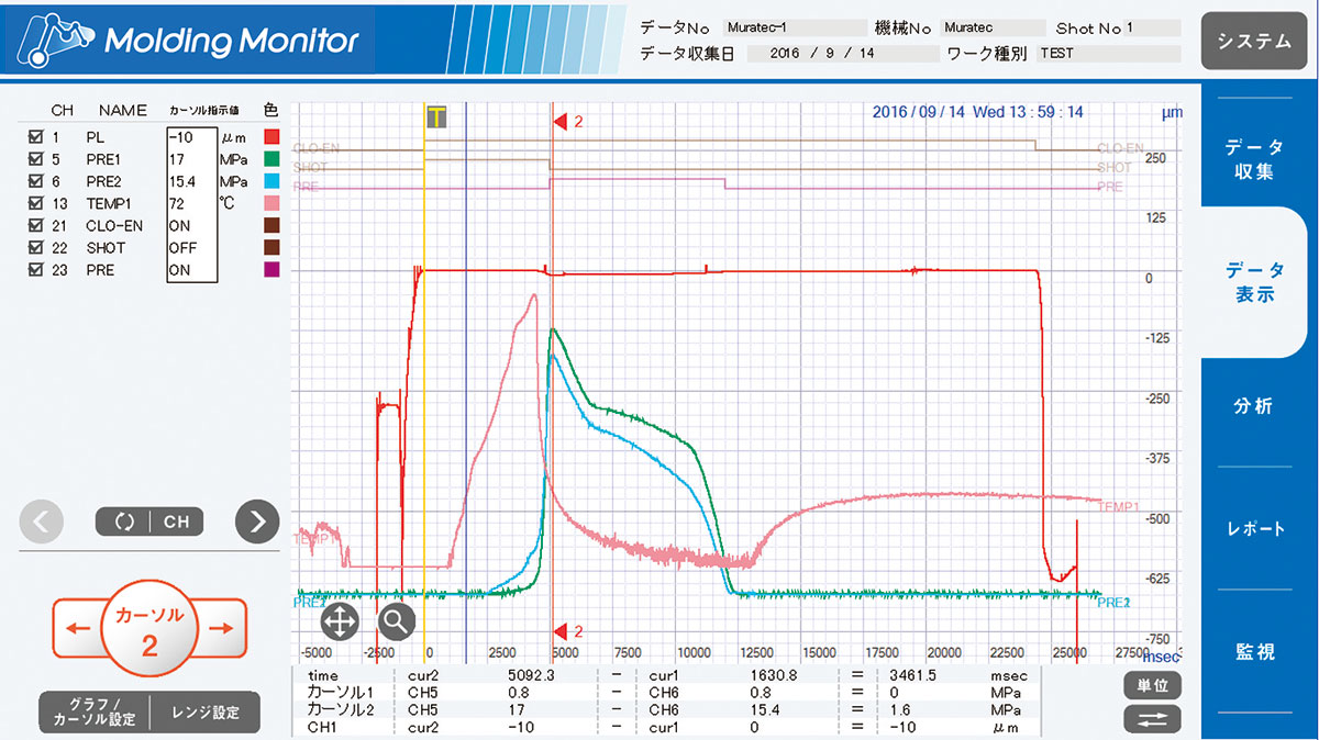金型に直接取り付け可能なムラテックの位置センサモジュールとともに、金型に組み込まれている温度 センサ、圧力センサの各出力数値を収集し、ワンショットごとの挙動をモニターに表示することで、成形機の設定数値と実際の金型の状況を比較できます。